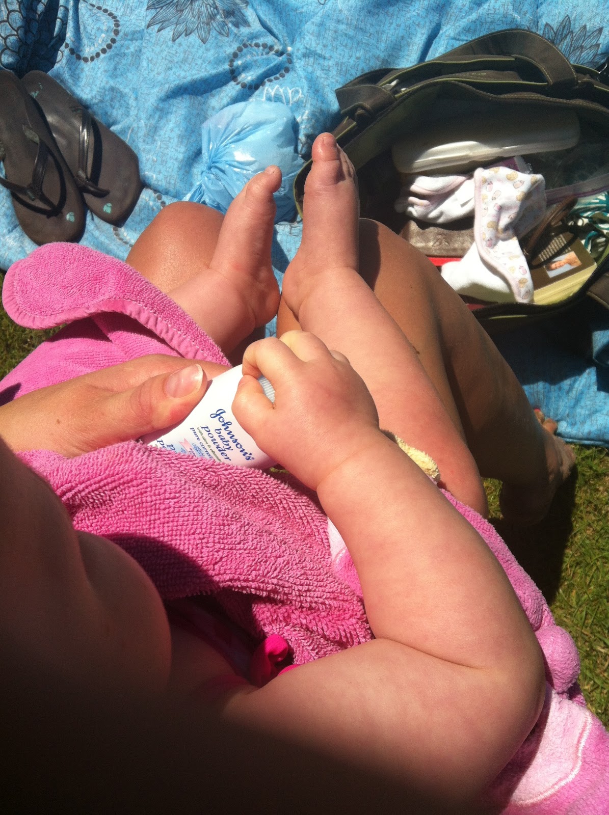 Thankfully I had seen a handy little trick to use Baby Powder to get the sand of little baby skin after a long beach day. The powder dried and cleaned that sand right up so all I had to do was wipe Claire clean with a towel and strap a new diaper to her! Brilliant! I know I'll will be using this trick A LOT over the summer, and hopefully you will too!
